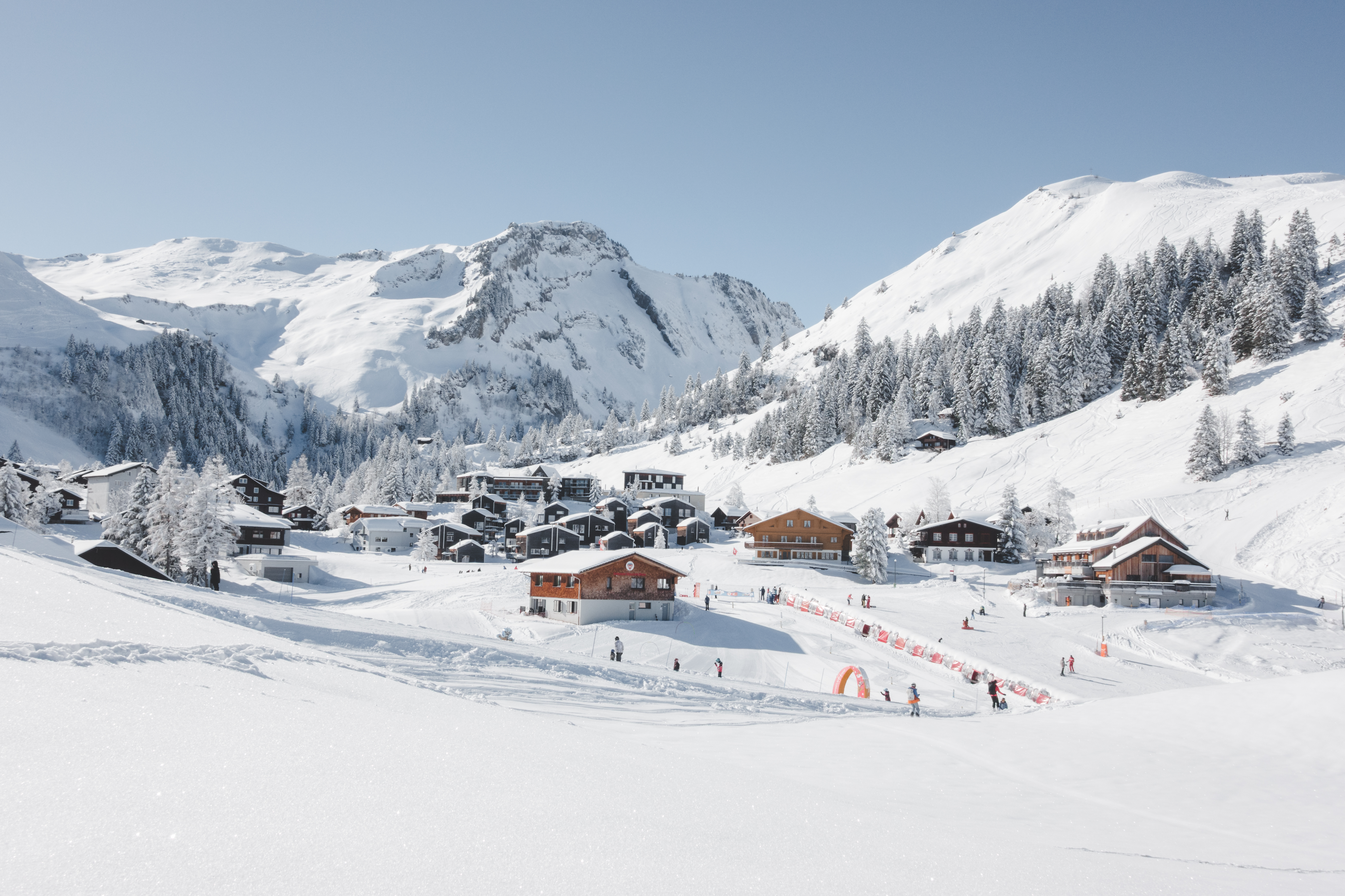Lernen Sie Skifahren oder Snowboarden im Winterland von Fröneli, mitten im Bergdorf.