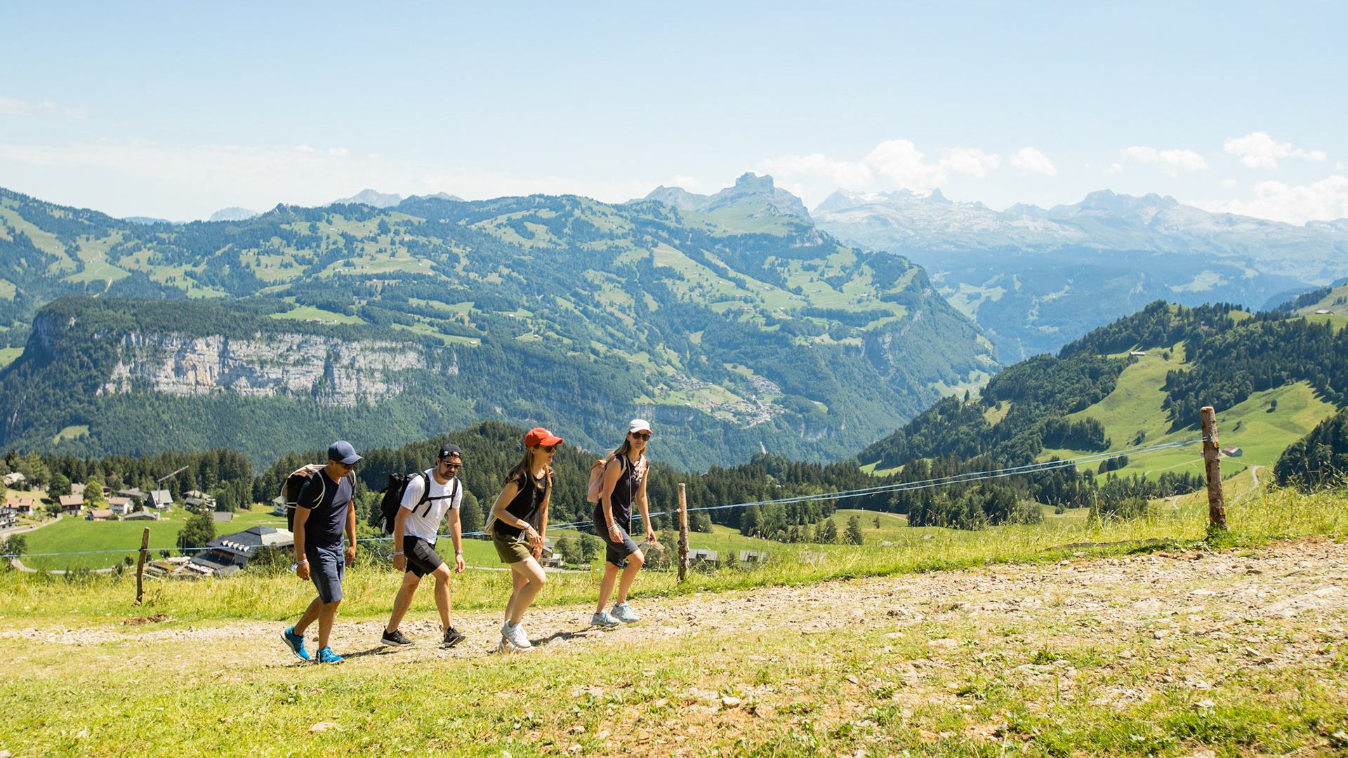 Vom Spazierweg bis hin zur anspruchsvollen Bergtour, egal ob im Bergdorf Stoos oder auf den Gipfeln - stetiger Begleiter auf jeder Tour ist das eindrückliche Panorama: Der Blick schweift über Gipfel und Seen.