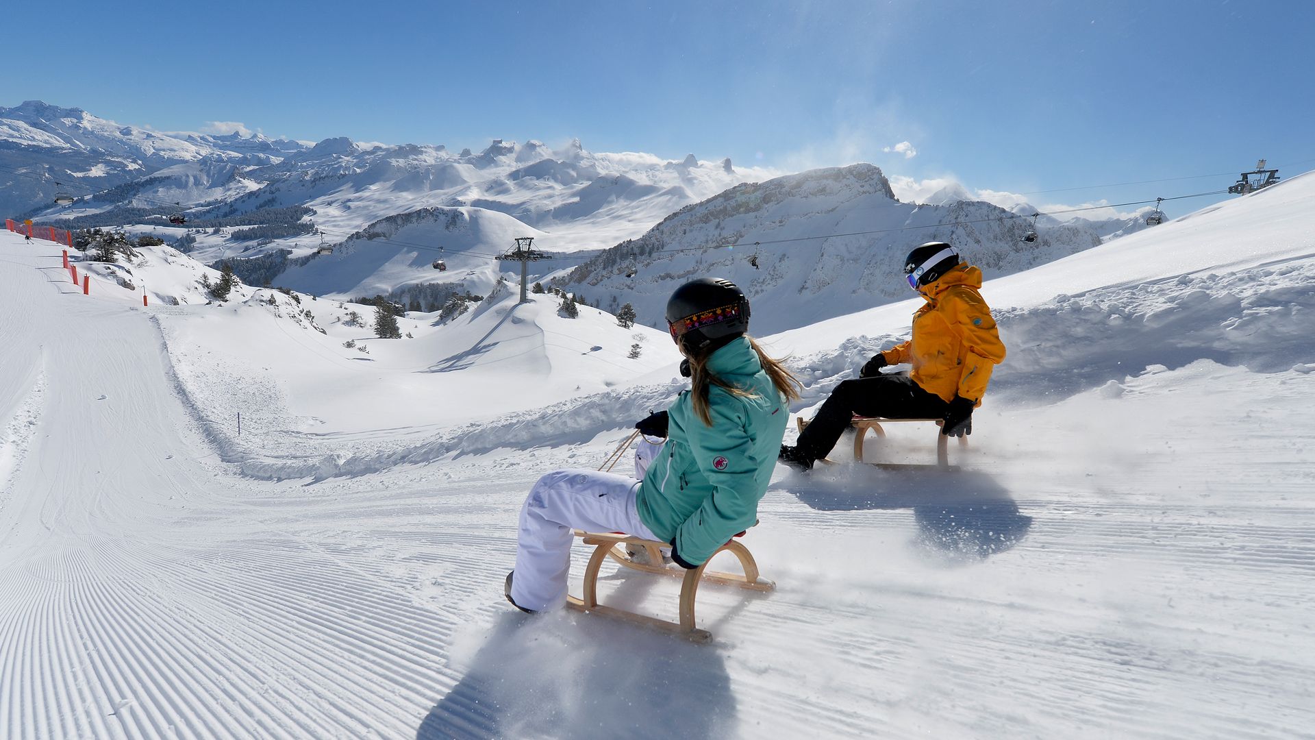 Die Mietschlitten der Mittelstation Sesselbahnen Fronalpstock sind mit Bremsen ausgerüstet.