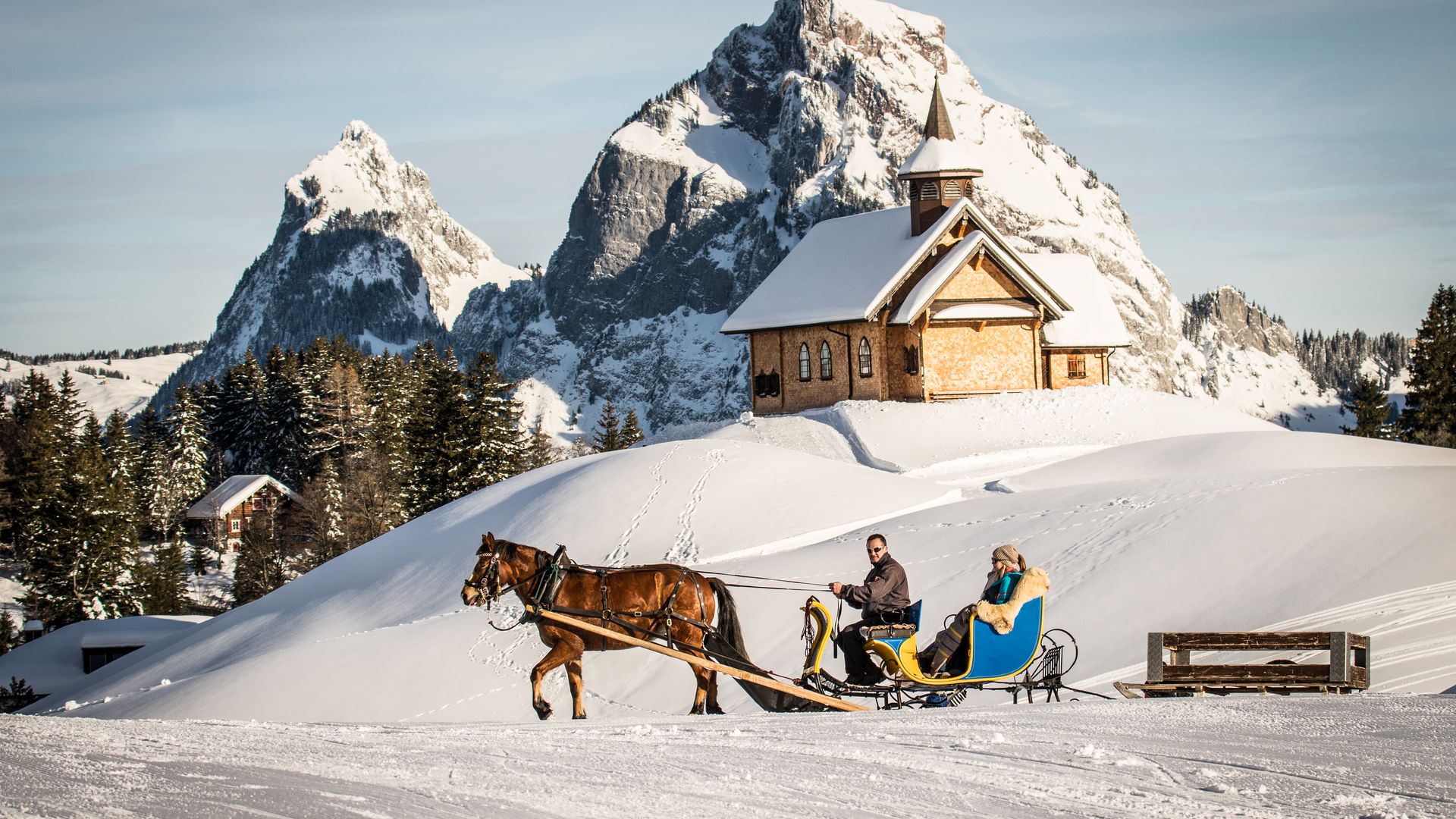 Mit der steilsten Standseilbahn der Welt erreichen Sie das autofreie Bergdorf Stoos. Ein Erlebnis für sich. Von der Bergstation führen zahlreiche Winterwanderwege in die Stille der Natur. Auch mit einer Pferdekutsche lässt sich die Idylle bewundern.