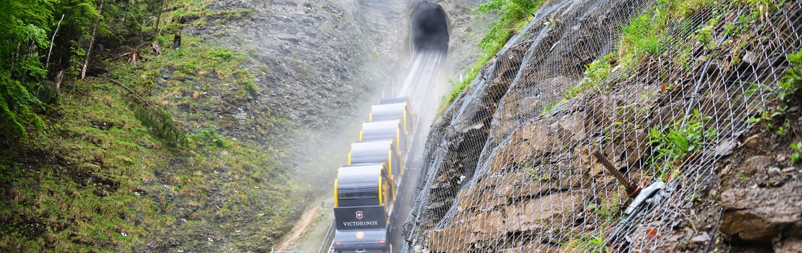 Bereits die Anfahrt auf den Stoos ist ein Highlight! Mit 110% Steigung fahren Sie immer waagerecht stehend mitten ins Bergdorf Stoos - ein Weltrekord. Denn bei uns fährt die steilste Standseibahn der Welt!