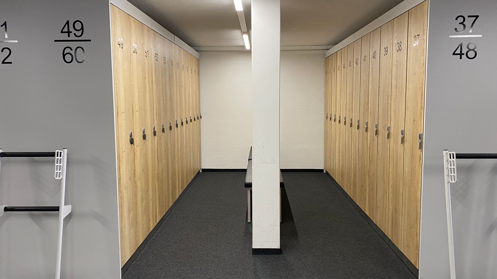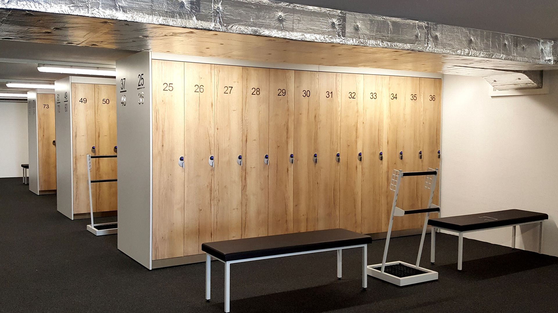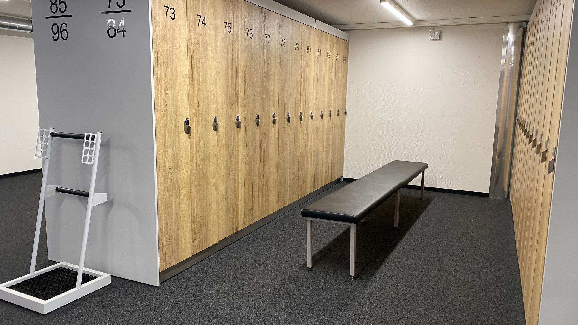 The benches between the rows of lockers allow you to comfortably put on and take off your boots. The lockers can accommodate the ski equipment of 2 adults and 1 child under 10 (2 pairs of skis with poles, 2 pairs of ski boots, 2 helmets plus children's skis with poles, children's ski boots and children's helmet). The lockers are 33cm wide, 45cm deep and 200cm high.