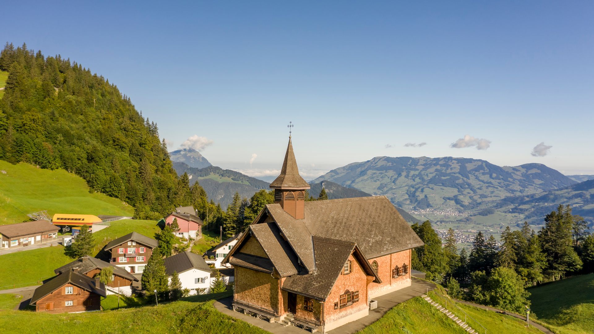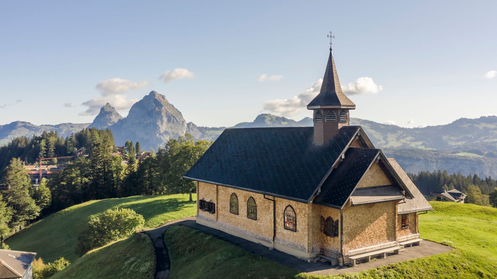 In the middle of the idyllic mountain village of Stoos is the Maria Hilf Chapel. The small mountain chapel was consecrated in 1932 and services are still held there today. Many wedding couples say "I do" in the mountain chapel. In the evening it is beautifully illuminated.